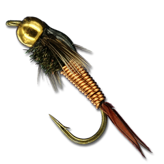 The Copper John combines a Prince Nymph tail, Brassie body, Pheasant Tail style thorax, Mike Mercer's style of Poxyback wingcase and a bead head. Truly innovative, the bead head and wire body help get this morsel right in the dining area without the aid of extra weight.