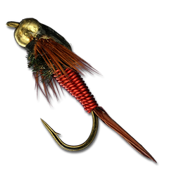 The Copper John combines a Prince Nymph tail, Brassie body, Pheasant Tail style thorax, Mike Mercer's style of Poxyback wingcase and a bead head. Truly innovative, the bead head and wire body help get this morsel right in the dining area without the aid of extra weight.