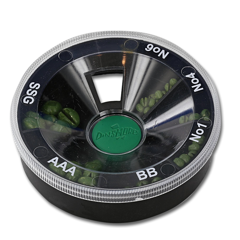 A convenient, easy-to-hold dispenser for the egg-shaped, non-toxic shot. Six compartments can be dialed, and there is a retaining area in the lid to reduce loss and help reload. The shot selector includes 6 sizes (SSG, AAA, AB, #1, #4 and #6).
