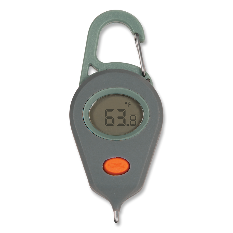 Compact and easy to handle, the Riverkeeper Thermometer is the only IPX7 submersible-rated digital thermometer designed by and for fly anglers. With a rugged exterior, a large UV-filtered screen, a replaceable battery, and a durable aluminum probe, this thermometer is built to withstand years of rigorous use outdoors. The Riverkeeper is the perfect tool for taking precise temperature readings, helping you determine whether it's safe to fish and when your quarry might be most active.