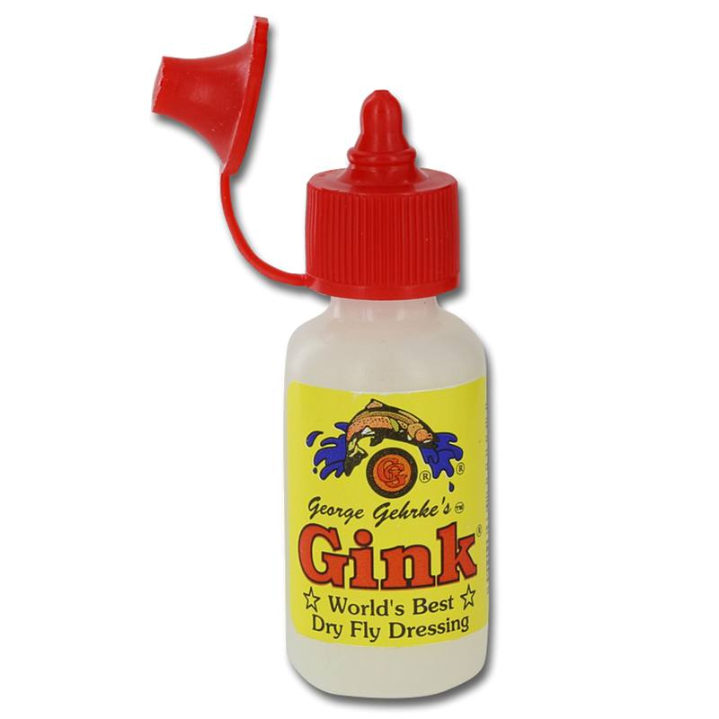 Gink® is a light paste that turns to a liquid at skin temperature. Upon coming in contact with cold water it returns to a clear, unseen, invisible gel that keeps water from making your dry flies or streaking streamers, wet. Flies stay dry for the normal useful life of any and all dry flies astream.