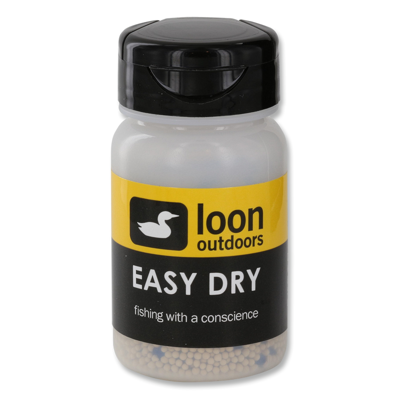 A treatment to revive flies composed of two things: drying beads and blue indicator crystals. A fly (still attached to the leader) is dry after a few quick shakes and ready for floatant. The blue indicator beads turn pink when the drying beads have become saturated and it is time to get a new bottle of Easy Dry.