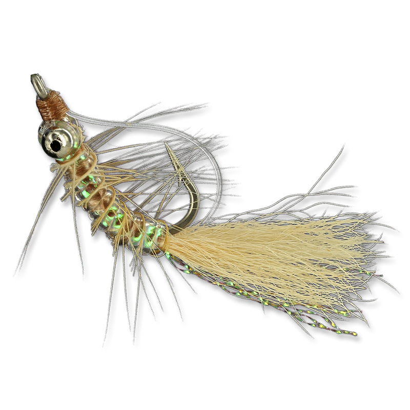 This innovative pattern was developed by professional fly tier Greg Miheve. It’s unique among bonefish flies, being tied with a split tail, along with a palmered hackle, giving it a delicate landing on the water. With the standard bead chain eyes, the sink rate is ideal for shallow water bones, and my "go to" fly while wading in shin deep water.