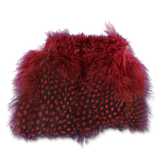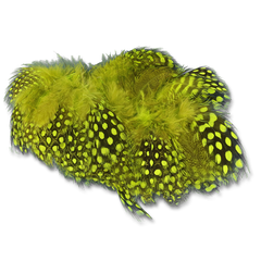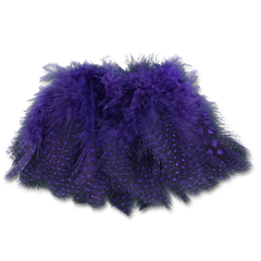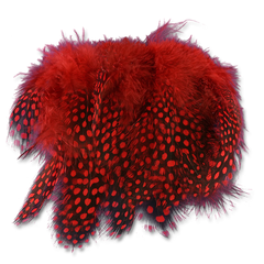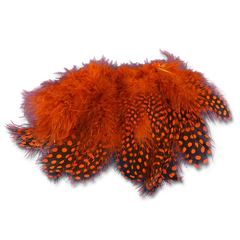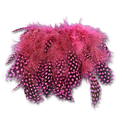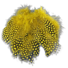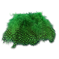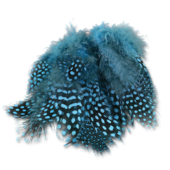 1st class feathers, neatly stacked and strung for easy selection. Spotted Guinea Fowl feathers are often used for hackle on Atlantic salmon and steelhead flies. Feathers have a banded look that copies many insects, and also many saltwater organisms such as shrimp and squid.