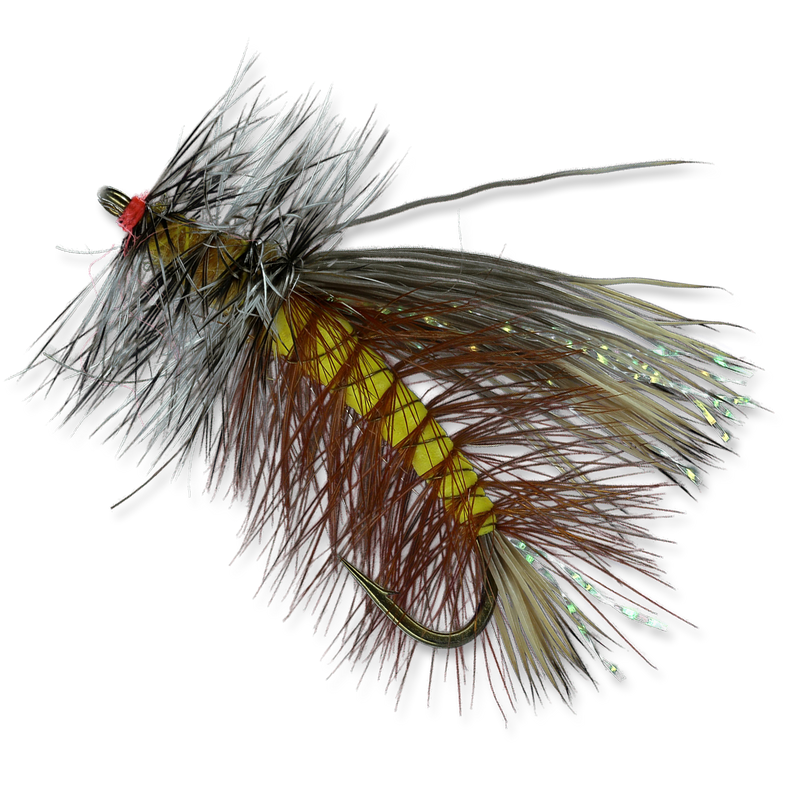 BODY: Super Fine Dry Fly Dubbing, yellow - with palmered Dry Fly Hackle, brown