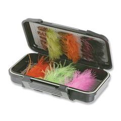 These are the best selling fly box in America! They are waterproof, float (when closed) and are lined with non-corrosive foam. There are no metal parts to rust, and our boxes are appropriate for both fresh and salt water. Molded from the most indestructible plastic imaginable. Each box is equipped with a gasket that'll keep any moisture out, and a firm clasp.