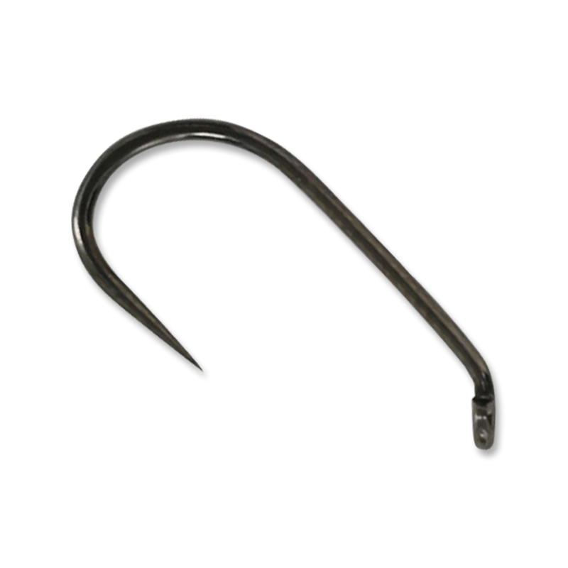 Straight, heavy wire, wide gape, needle point, barbless, down-eye, 1x long, black nickel finish.